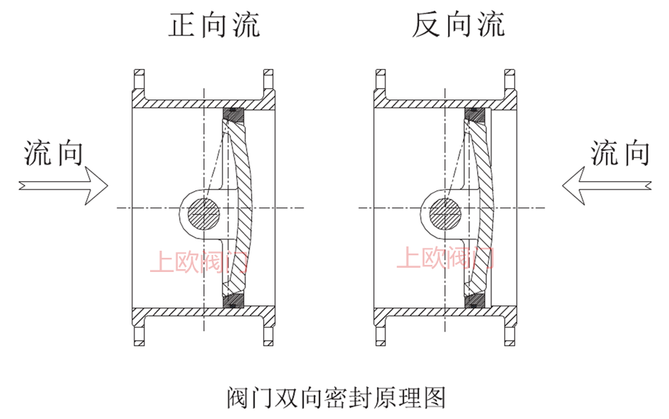 雙向流閥門的最主要功能是既能在正向壓力時(shí)密封良好,又能在反向壓力或反向壓力大于正向壓力時(shí)也能密封良好。當(dāng)正向壓力作用時(shí),介質(zhì)壓力推動(dòng)閥板向前移動(dòng),閥桿彈性變形,閥板密封面緊貼閥座密封面?zhèn)鬟f壓力,將閥座推向閥體臺階,使之密封良好。當(dāng)反向壓力作用時(shí),介質(zhì)壓力推動(dòng)閥板向后移動(dòng),閥桿彈性變形,介質(zhì)壓力同時(shí)推動(dòng)閥座向后移動(dòng),使閥座密封面緊貼閥板密封面并保持密封比壓,使之密封良好。