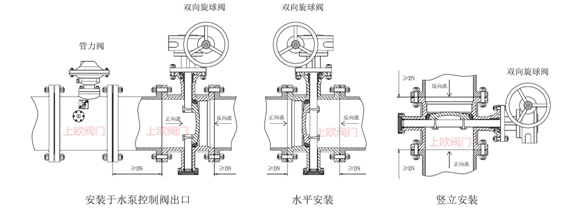 7)無論臥式安裝或立式安裝,當(dāng)無法確定流道方向時(shí),閥門打開時(shí),蝶閥為大面端頭朝向進(jìn)水方向;