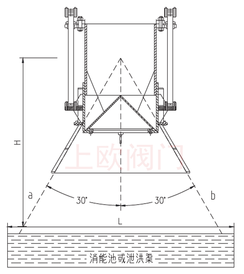 (2) 帶整流罩型(限制發(fā)散型):利用導(dǎo)流罩有效控制錐形閥的出口發(fā)散程度:都用于水頭高,出口狹小,涉及建筑物或其他設(shè)施等;如圖所示,用戶應(yīng)根據(jù)設(shè)計消能池或泄洪渠的具體尺寸選擇合適的導(dǎo)流罩,具體如圖所示,a、 b為導(dǎo)流罩的夾角延長線,L為消能池或泄洪渠的寬度,H為導(dǎo)流罩夾角頂部到消能池或泄洪渠表面的高度,按等邊三角形原理計算該選用的導(dǎo)流罩角度。