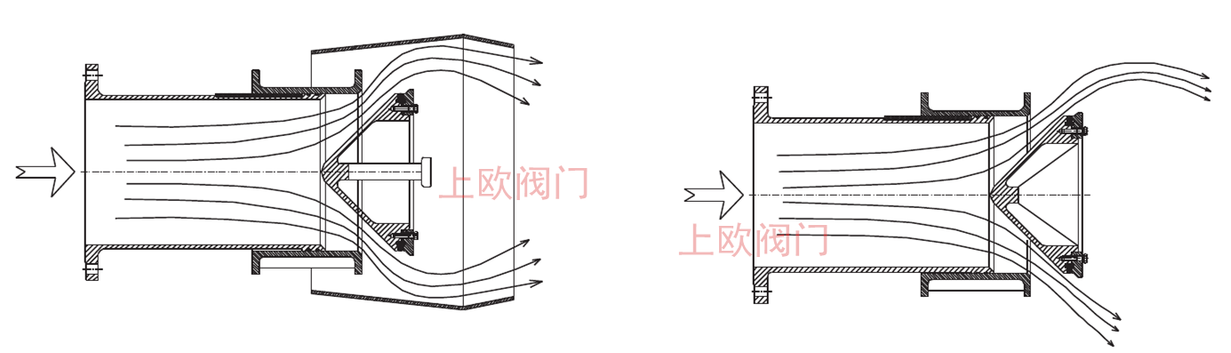 有整流罩與無整流罩的出流示意(一般情況加有整流罩會略降低閥門流量系數(shù)2—3%)