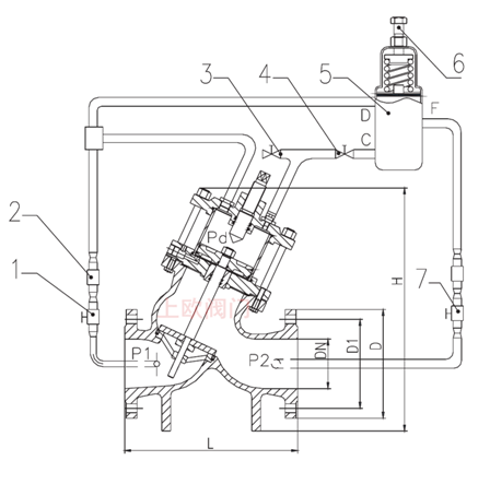 本閥門由主閥和外控組件組成,主閥由閥體、閥桿、閥板、閥蓋、閥座、活塞和活塞缸及調(diào)整螺桿等構(gòu)成,外控部件主要由先導(dǎo)閥、調(diào)節(jié)閥、手動(dòng)球閥等組成。