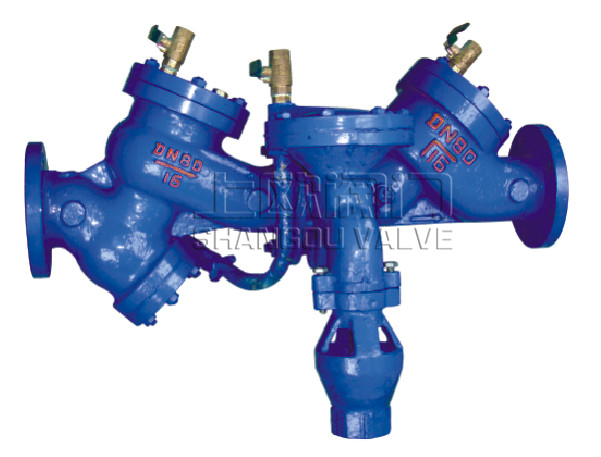 (HS41X-A)帶過(guò)濾防污隔斷閥由兩個(gè)隔開的止回閥和一個(gè)液壓傳動(dòng)到泄水閥組成,第一個(gè)止回閥閥體內(nèi)裝有過(guò)濾網(wǎng)。由于止回閥的局部水頭損失,中間腔內(nèi)的壓力始終低于入水口的壓力。這個(gè)壓差驅(qū)使泄水閥處于關(guān)閉狀態(tài),管路正常供水。在壓力異常時(shí),(即出口端壓力高于中堅(jiān)腔),即使兩個(gè)止回閥都不能反向密封,安全泄水閥也能自動(dòng)開啟將倒流水泄空,并形成空氣隔斷,保證上游供水衛(wèi)生安全。